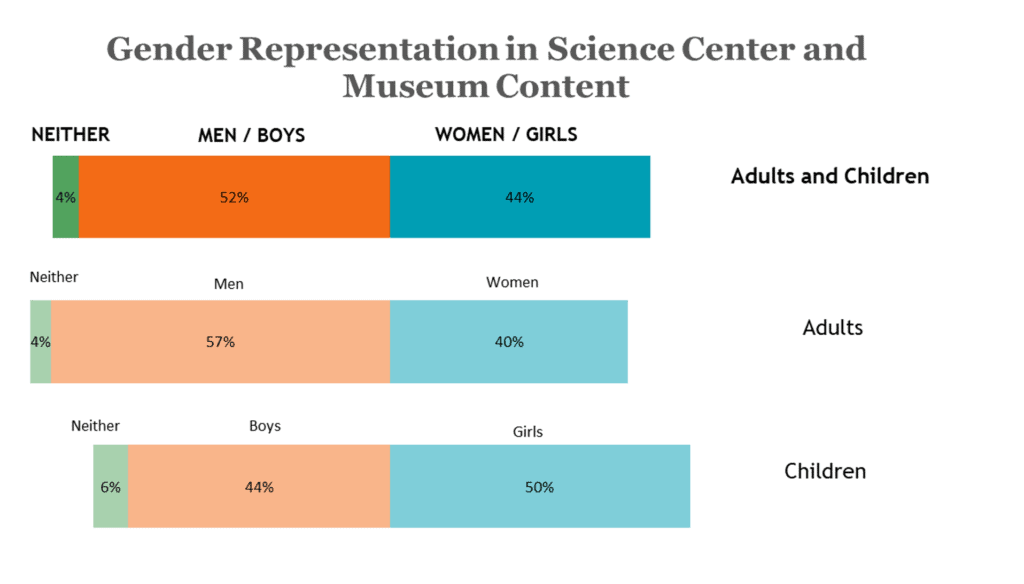 Across the data shared with us by 51 museums, 44% of individuals depicted in museum content were perceived as women or girls. However, stark differences arise when you look at the differences between representation of adults and children, types of museum content, and who is depicted as a STEM professional. Gender representation was more equal among depictions of children (50% girls and 44% boys) as compared with adults (40% women and 57% men). In some instances, an individual’s perceived gender was unclear or neutral (6% of all children and 4% of all adults).