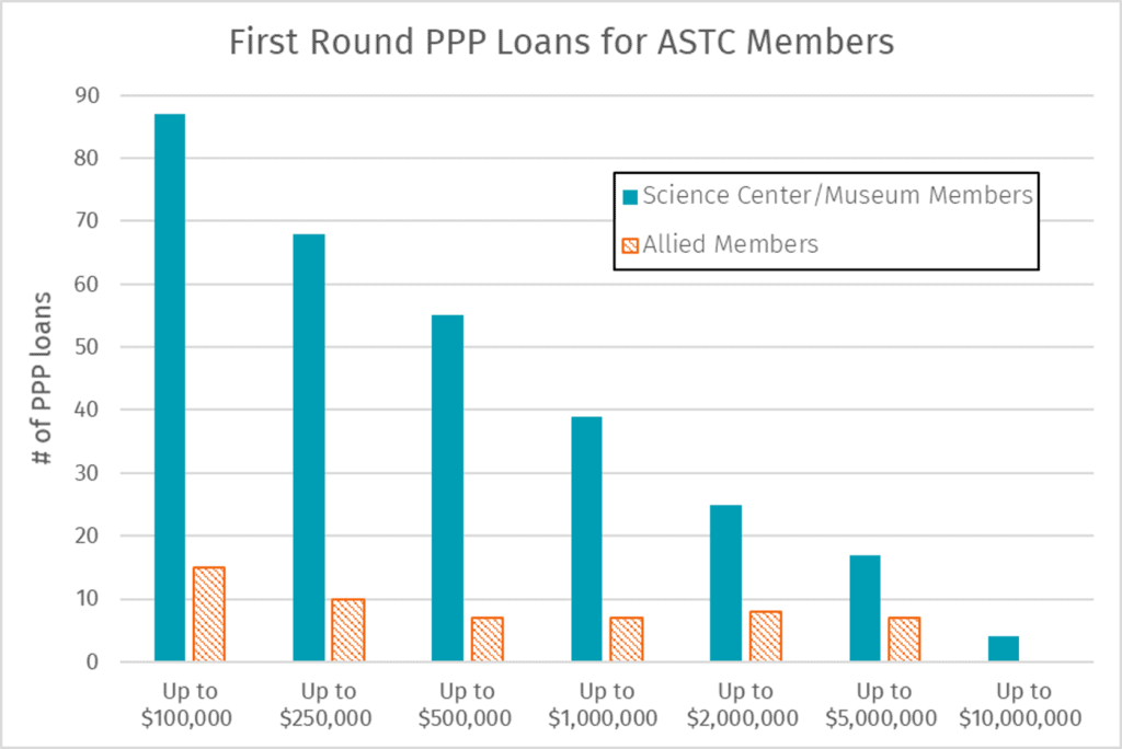 In addition, more than 50 Allied Members received at least $44.7 million in first-round PPP loans. This is a diverse category of members that currently includes companies and independent contractors serving the field, emerging science centers and museums not yet open to the public, foundations, scientific societies, community organizations, government agencies, and more.